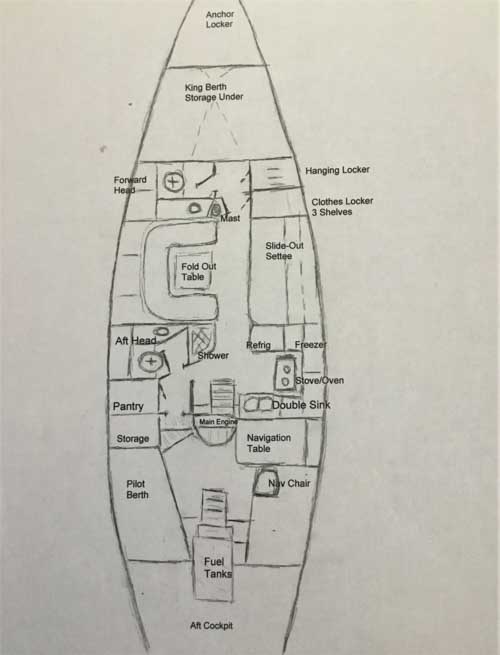 The simple staysail ketch rig makes Shambhala easily handled by a small crew. Her performance under sail is comparable to more more lightly constructed vessels while the ketch rig allows many efficient sail plan choices. The solid steel construction and traditional design makes her a truly seaworthy boat.